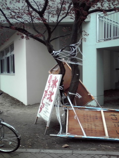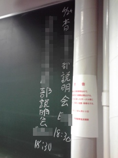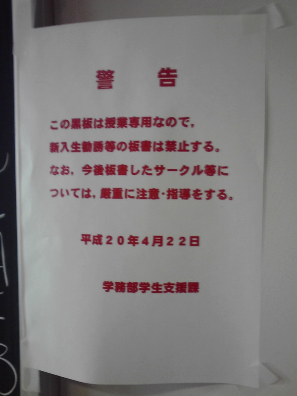 こんばんは。今日も元気にやってます。 元気なんだけど、だんだん元気じゃなくなるかも。 まず、タイトルの通り、風が強い。サクラの花びら散り始めてるし。まだ散るな! 自転車は倒れまくってたし、外の立看板も哀れな事になってました。 でも、風が強くても勧誘合戦はなかなか止みません。にぎやかなのは良いんですが、大学側も業を煮やしたか、 各教室にこんな張り紙が張り出されてしまいました。それも黒板両サイドに。 しかし!権力に屈しない北大生、「そんなの関係ねぇ!」と言わんばかりに 今日も書き残されてました(笑 それにしても、俺いよいよやばいかも。 昨日くらいから喉が痛い。風邪ひいた? 今日も、学校でそこらじゅうで咳してる人いるし。もう授業中もあっちからゲホゲホこっちからゲホゲホ。 北大やばいんじゃないか? はしかの患者とかいたりして。 風邪だけじゃない。昨日の夜、授業プリントや時間割を挟んだ、「生命線」とも言えるクリアファイルを教室に置き忘れたし。見つかったから良いけどさ。 別の時間にも上着を置き忘れそうになったし。 友達に話しかけてみたら別人だったし。 キャッシュカードに始まって、そのうちもっと大事なものを忘れたりして。 自分の記憶とか、大切な人とか。 洒落にならん。 先輩やさしいし、いろんな話聞かせてくれるし、ご飯食べさしてくれるし。 大学っていろんな人がいるんだなって事もわかるしね。 さて、今日ついに旭川でも桜が開花したんですね。 去年はもっとずれてたよなぁ。札幌と旭川で。 今年の桜前線速すぎ。 で、こんな事を書くために去年のブログを見てたら、4月27日に吹雪だったって記事があったりしてびっくりなんだけど、去年は旭川の標本木を見に行ったんだよね。 札幌の標本木(北海道神宮)も見に行きたいなぁ。 でも暇あるかなぁ…… きょうの気温〔℃〕(気象庁HP) 札幌 最低7.7 最高23.2 旭川 最低4.6 最高26.0 やっぱ旭川の方がネタにはなる。