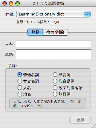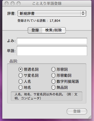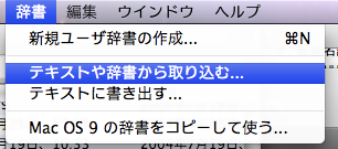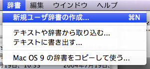 つまり、僕は旭川で採った自分の尿を、札幌まで運ぶという偉業を成し遂げた訳です。 ってか、採尿器具使いにくい。 試験管状の容器の、中程の穴に直接命中させる(ように指示されている)んだけど……なんじゃこりゃ。 「簡単清潔」とか言ってるくせに、思いっきり飛び散った。 (器具に当たって跳ねたんだよ。「元気よすぎ」とかじゃなくて。) 結局トイレ軽く掃除する羽目になったし。 これ使うときは、一回紙コップに入れて移し替えた方がいい。 それにしてもすごいわ。健康診断。 最初に磁気カードを渡されるんだよね。 各検査場でカードを通すと、自分の名前が画面に出る。 結果は全部コンピューター管理。 身長体重も自動測定! ちょっとしたカルチャーショックだったね。 でも、身長が微妙に縮んでたのはもっとショック。 何てこった!!! そうそう。 検診会場には当然のごとく、(主に運動系)部活の新入生勧誘隊が大挙して押し寄せてくるんですが、 どこぞの大学では門がぶっ倒れたらしいんで、気をつけて欲しいものです。 調べてみたら、古い方の学習辞書には、何と自動で17803もの単語が登録されていたことが判明。 そりゃ無くなると不便だよなぁ。 そんな訳でいろいろ試行錯誤したけど、なんとか終わったぜ。 検索しても、最近の記事が出てこないからてこずったけど、一応ここを参考にしてみました。 ただ、これは別のMacに移す手順を説明した記事じゃないので、僕が勝手にまとめてみました。 誰かの助けになればいいなぁ。 [僕の条件] 旧:Mac OS X 10.3.9 "Panther" 新:Mac OS X 10.5.2 "Leopard" 入力ソフトはいずれも「ことえり」。ことえりのバージョンは知らん!(OS付属からいじってない) 【学習辞書の移行法】※画像はクリックで拡大 ★1 ◆古いMacで◆ (ユーザ名)/ライブラリ/Preferences/com.apple.JapaneseAnalysis/LearningDictionary.dict つまり、 (ユーザ名)フォルダ ↓「ライブラリ」フォルダ ↓「Preferences」フォルダ ↓「com.apple.JapaneseAnalysis」フォルダの中の 「LearningDictionary.dict」というファイル を、とりあえずデスクトップにでもコピーする。 ★2 次に、「LerningDictionary.dict」を、ファイル共有機能(Macについてる機能の奴。Winnyみたいなのじゃないよ)を使い、新しいMacに移す。 ファイル共有のやり方がわからなければ、デジカメや携帯のメモリー経由でもいい。 とにかく、そのファイルを新しいMacに移す! 移したファイルは、 ◆新しいMacで◆ わかりやすいように、デスクトップにでもおいておこう。 ★3 ◆以下、新しいMacで◆ かな入力モードにし、「あ」って書いてあるメニュー(正式名称は知らん!)から、「単語登録/辞書編集...」を選ぶ。 「ことえり単語登録」ってウィンドウが開くはず。 ★4 「辞書」メニューから、「新規ユーザ辞書の作成...」を選ぶ。 名前は好きにすべし。俺は何のひねりもなく『新規辞書』にした。 ★5 ことえり単語登録のウィンドウの辞書欄が、『新規辞書(自分で決めた名前)』になるはず。 次に、その真っ白な辞書に、古い辞書のデータを移そう。 「辞書」メニュー → 「テキストや辞書から取り込む...」を選ぶ。 テキストだとうまくいかないっぽいから、さっきの辞書ファイルを読み込もう。 さっき移しといた「LerningDictionary.dict」を選択。 (場所は、自分でおいた場所。★2の指示通りならデスクトップにある) 後は勝手に読み込んでくれる。 めでたく、新Macの脳味噌に17804コの語句が追加された。 なぜか1個増えてるけど、気にしない。 結果、優先順位こそ前後はあるものの、以前の「癖」の大部分を引き継げた。 ところで、(使わなかったけど)この辞書を「テキストに書き出す...」するとなかなかおもしろいよ。 自分の口癖?が見えたり、意外な語句が入ってたり、タイプミスがそのまま登録されてたりw せっかくなんで、僕の辞書から一部抜粋して載せてみました。 流し読みできるけど長いんで、「つづきはこちら」からどうぞ。 あと、YouTubeに、新品の最初に流れるムービーがあったんで、見たかったらどうぞ。 →YouTube - Welcome to Leopard video