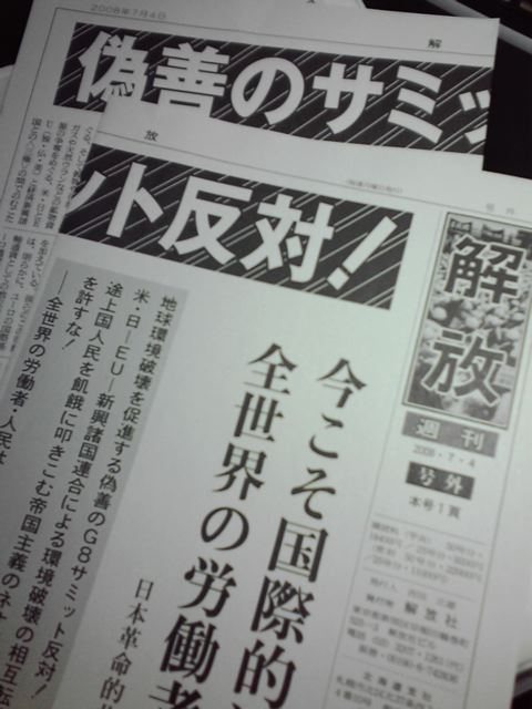 今日からサミットが開幕しましたね。 いろいろある筈なんですけど、肝心のニュースがなかなか見れません。なんてこった… さて、僕は…今日は夕方から札幌駅にいました。 まぁ……あんまり多くはないですね。 それでも、北大の学術会議に参加した人とかとも話せたりして、目的に近づいた感はあります。 そんで、夕方までは学校に居たんですけど、北大の中でも変なのがうろついてました。 某 革マル派っていう過激派集団の機関紙 を持った連中…(1) がそこら辺うろちょろしてたり、2限の授業が始まる前にいきなり変な絵を黒板に貼り出して、 「洞爺湖サミット反対のデモ行進に参加を!」 って訴える演説をしてく人たち…(2) もいました。農学部自治会と、「早稲田大学から来た」って人なんですけど、農学部も早稲田も暇なんですかね。工学部めちゃ忙しいのに。 そういえば食堂の近くでもここ数日、農自治とかがビラ配りしてたなぁ。今日は「九州から来ました」って人もいたんですけど、はるばるご苦労ですよね。テストとかあるだろうに、暇なんですかね。 しかし彼ら暇人方もかわいそうに、誰にも相手にされてませんでした。 そして、昼休み中に教室に撒かれた機関紙を、3限が始まる前にオジサンが回収して捨ててました。 印刷するだけ資源の無駄ですよね。まったく。 で、さっき調べたんですけど、農自治って革マル派系なんですか? (1)と(2)は別物だと思ってたんだけど、(2)が呼びかけたデモで見かけた旗が、見事にここと一致してました。 Wikipediaなんで、どこまで本当かは知りませんけど。 まぁ21世紀にもなってご苦労さんな事ですな。 せっかくなんで、せいぜい北海道を堪能して頂ければ俺はそれで良いと思いますが。 |