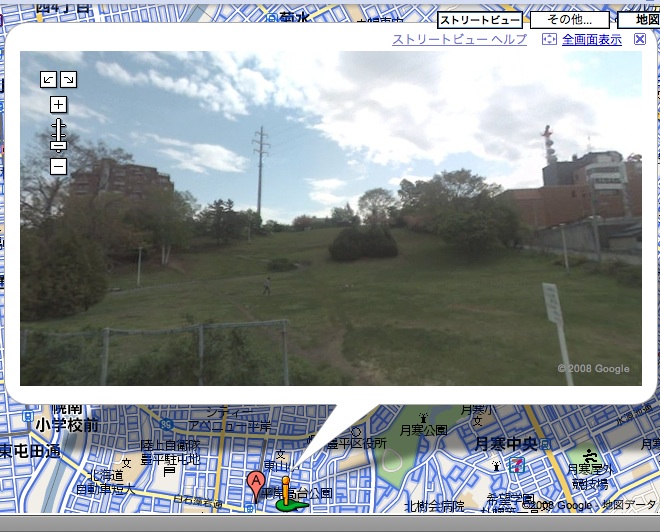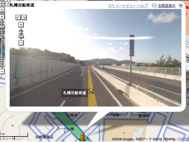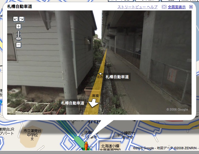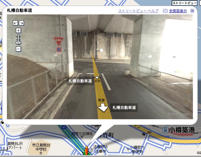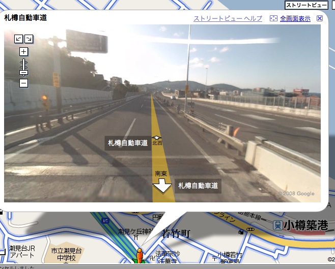 北大正門 すすきの交差点 平岸高台公園 ばっちり映ってる。 対応する全国12都市のうち、北海道が3都市も入っているのは嬉しい限り。 ただ、札幌、小樽、函館が入ってて旭川が入ってないのは納得いかん。早急に対応させてくださいGoogle様。 あと北大構内もお願いしたいね。 ところで、さっそくオカシナ画面を発見してしまった。 札樽自動車道の、小樽IC付近。 見ての通り高速道路なんだけど、 ここの一歩先。 いきなり家庭の裏道にジャンプする(笑 壁に向かって突き進む…… で、また上に戻る。。。。 何があったんだろね。 皆さん、自分の目で確かめてみましょう↓ Google Maps〜小樽IC